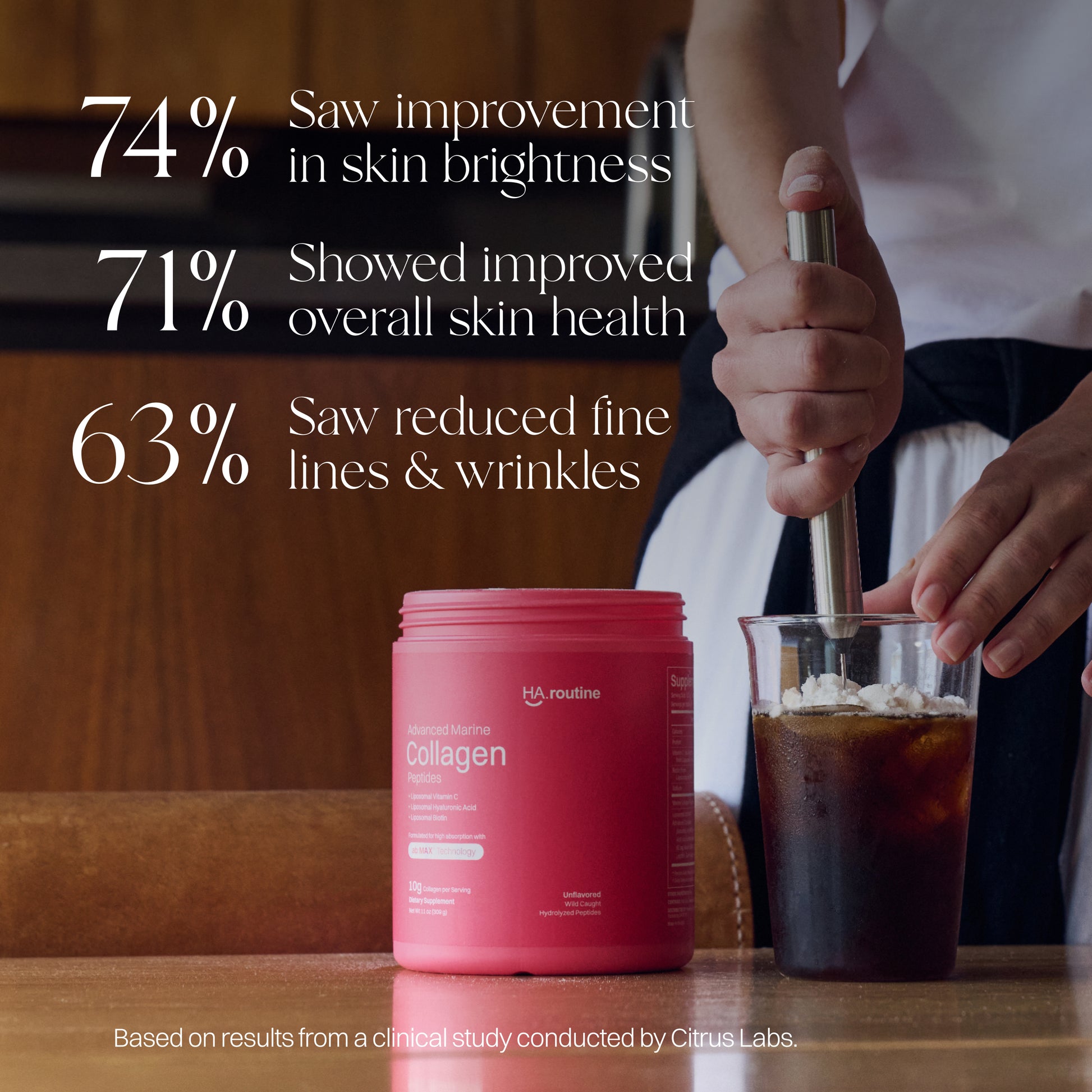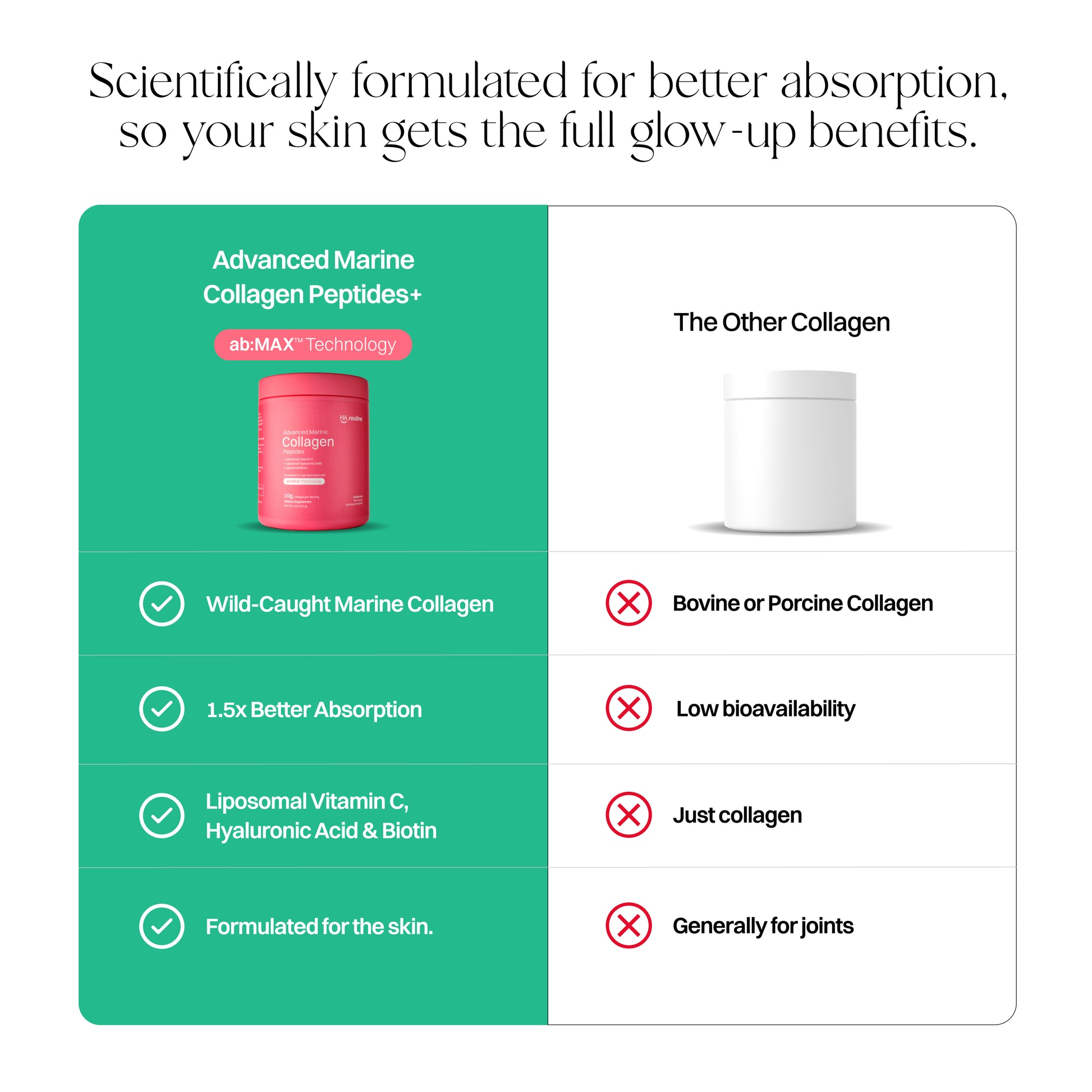 Smooth skin, less wrinkles, and hydrated skin—what’s not to love? Our Advanced Marine Collagen Peptides+ delivers 10g of high-quality wild caught marine collagen per serving, plus 90 mg of liposomal vitamin C, 60 mg of hyaluronic acid and 1000 mcg of biotin for a major skin boost. This formula is powered by ab:MAX technology for superior absorption, so it actually works. Bonus: It’s sugar-free and non-GMO!