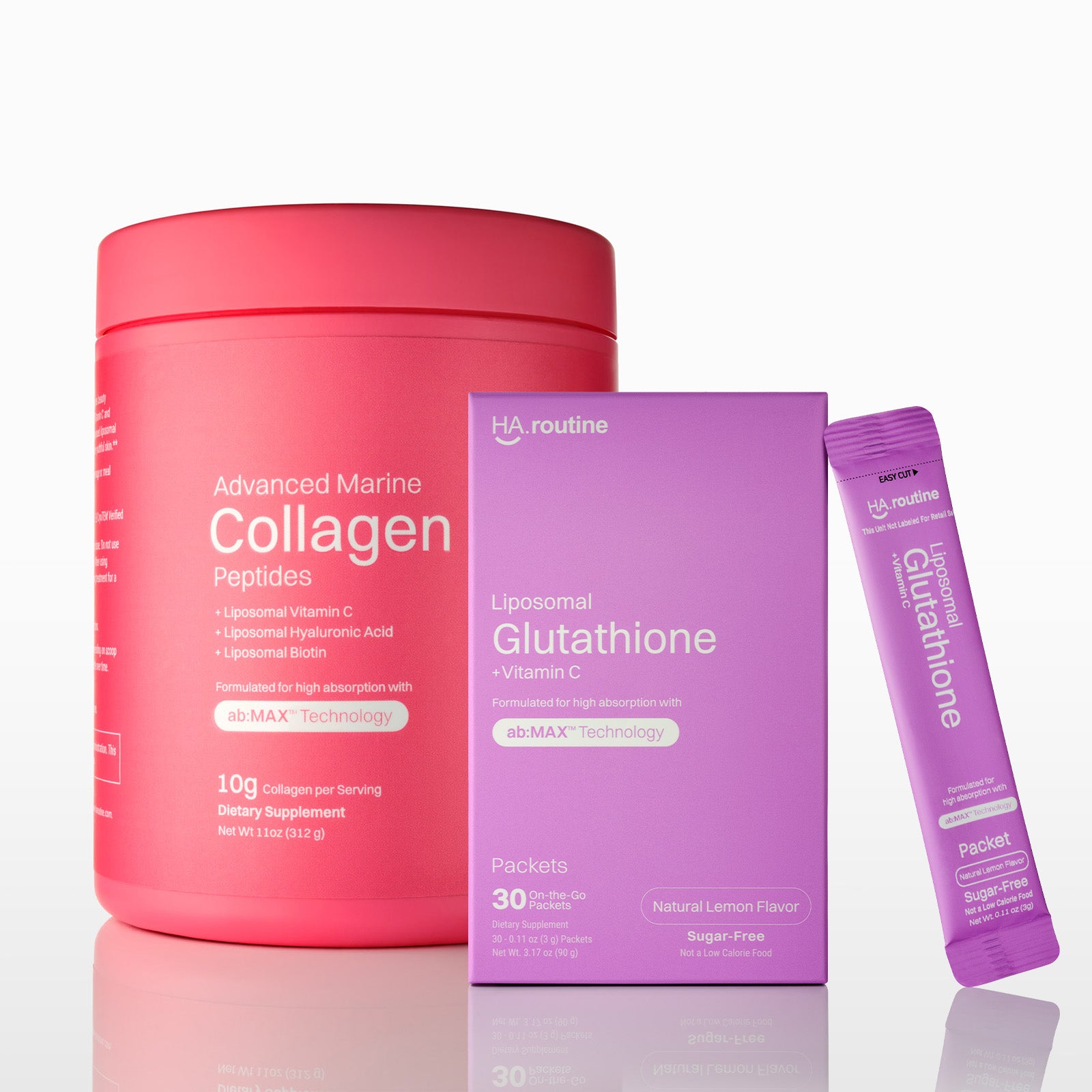 Elevate your inner beauty routine with this powerhouse pairing: Advanced Marine Collagen Peptides+ and Liposomal Glutathione. Designed to work synergistically, this duo supports collagen synthesis, brightens skin tone, and defends against oxidative stress — all with maximum absorption thanks to our ab:MAX™ liposomal technology.